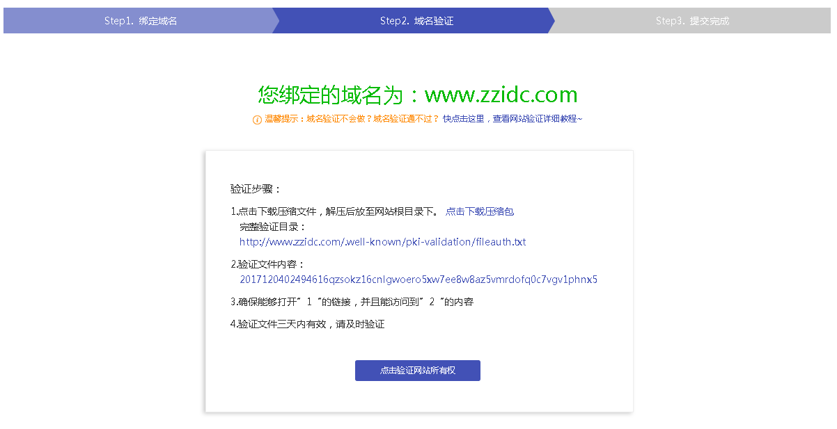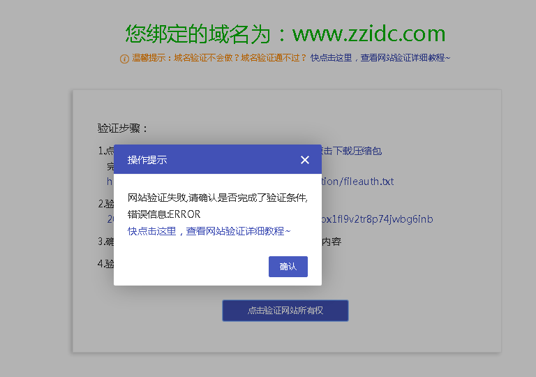 第一步:下载验证文件“点击下载压缩包”,将解压后的文件放置www.zzidc.com网站跟目录
